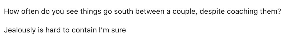 How often do you see things go south between a couple, despite coaching? Jealousy is hard to contain, I’m sure.